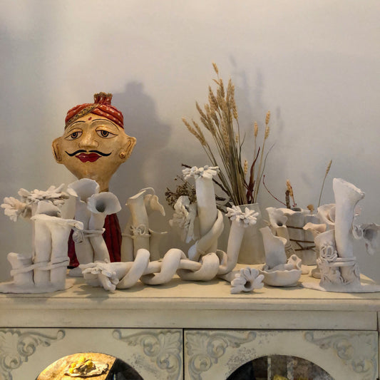 Drawing from personal memories and universal symbols of comfort, she crafts forms that evoke warmth, playfulness, and curiosity. Her use of texture, materiality, and hand-built imperfections brings a tactile, almost storybook-like quality to her work—where every curve, indentation, and raw edge carries echoes of time, touch, and sentimentality.