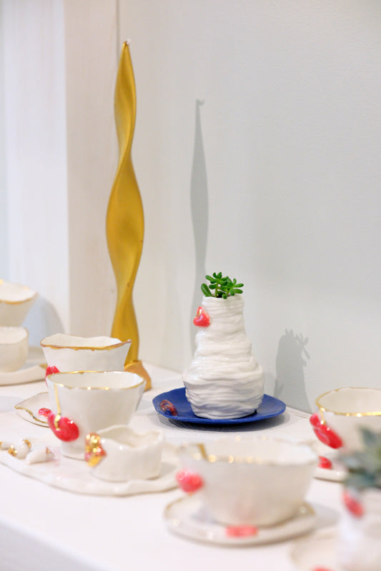 **Hania Jneid is not just a ceramicist but an artist who explores emotion, memory, and the intangible connections between objects and human experience. Through her work, she investigates the concept of nostalgia—creating pieces that awaken a sense of wonder, innocence, and the purity of childhood. Her objects are more than functional; they are vessels of feeling, inviting the user to reconnect with their inner child and the magic of fleeting moments.