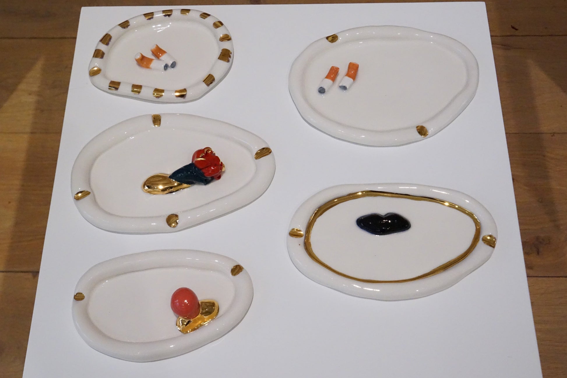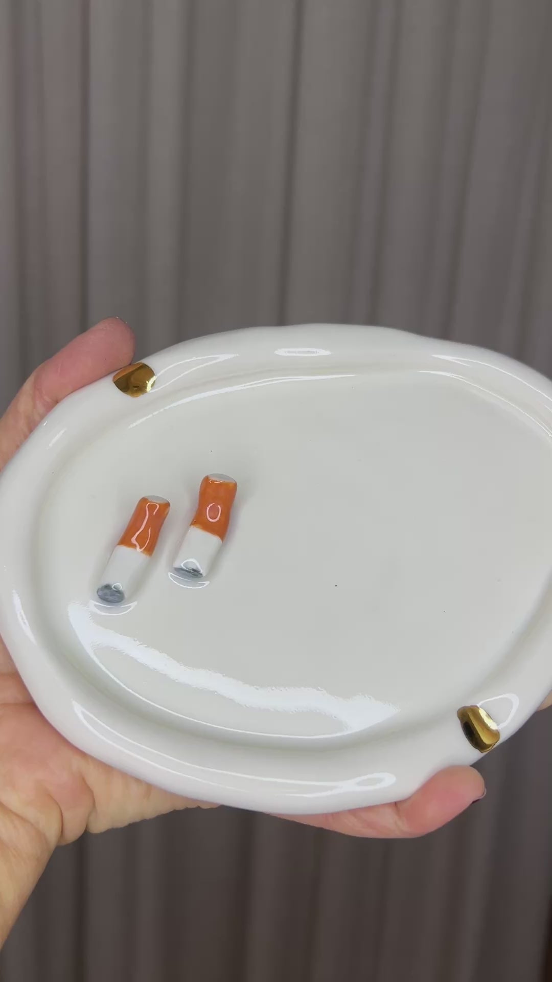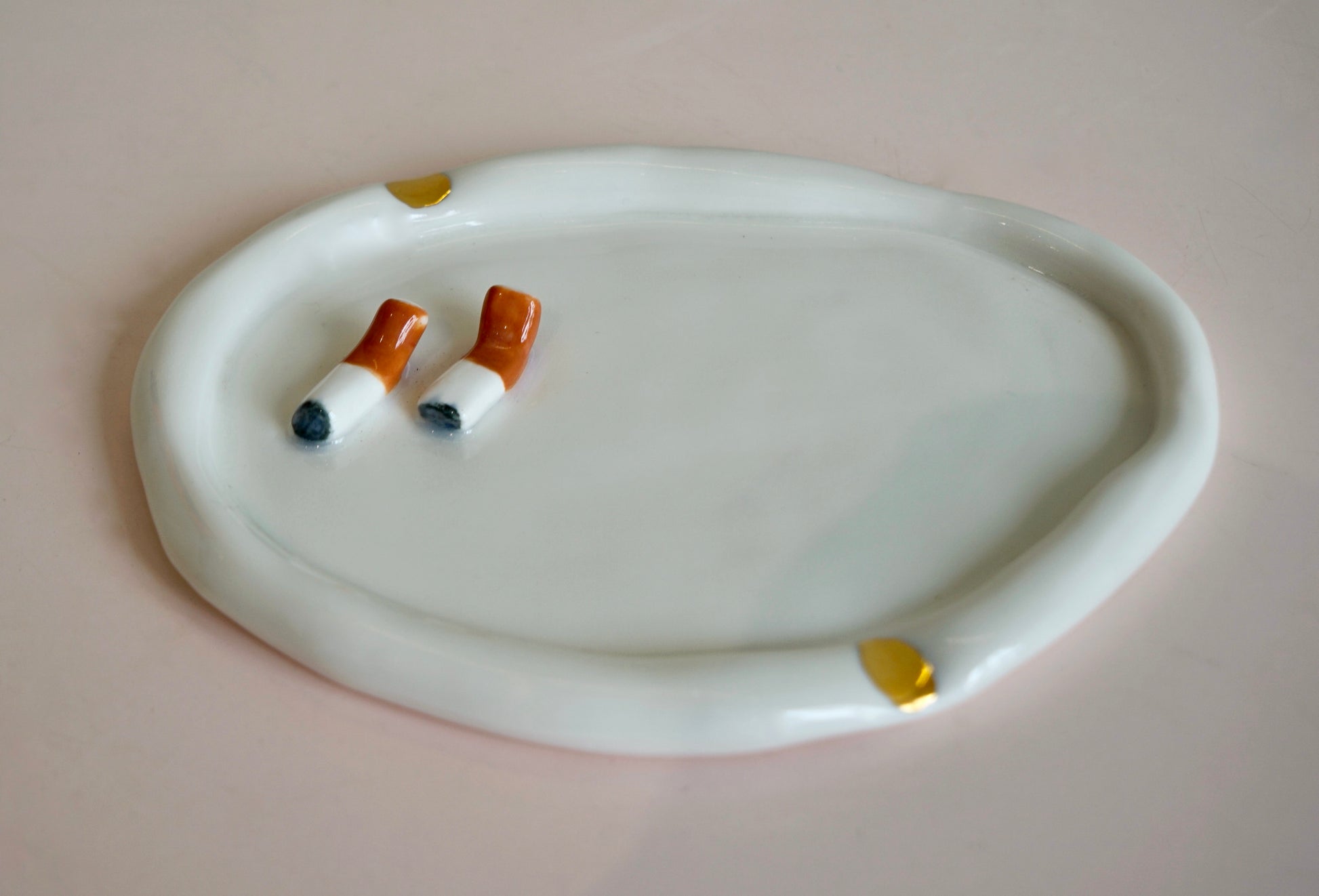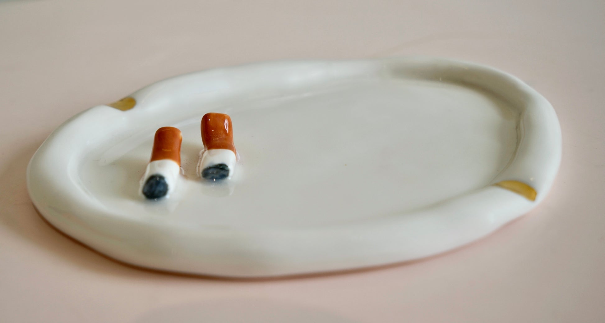 "Hania Jneid’s sculptural ashtray in pure white porcelain captures the ephemeral nature of habit and indulgence, immortalizing it in delicate, permanent form. Embedded within the surface, porcelain cigarettes appear abandoned mid-use, blurring the boundaries between function and statement. This piece explores the tension between fragility and endurance, elevating a transient act into an enduring object of contemplation. With its raw yet refined presence, it transforms an everyday ritual into a thought-provoking sculptural gesture."