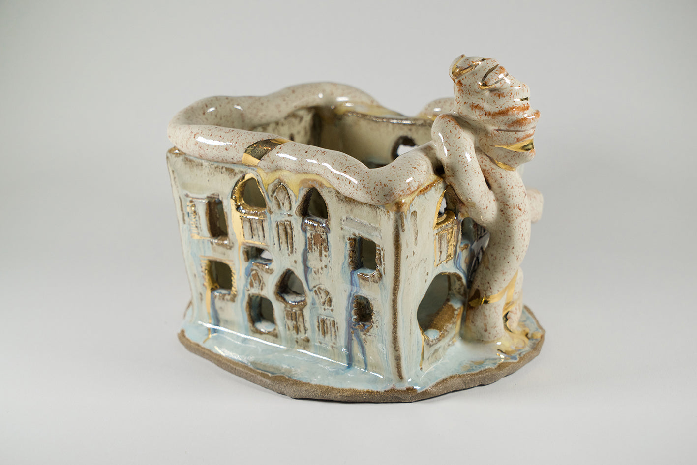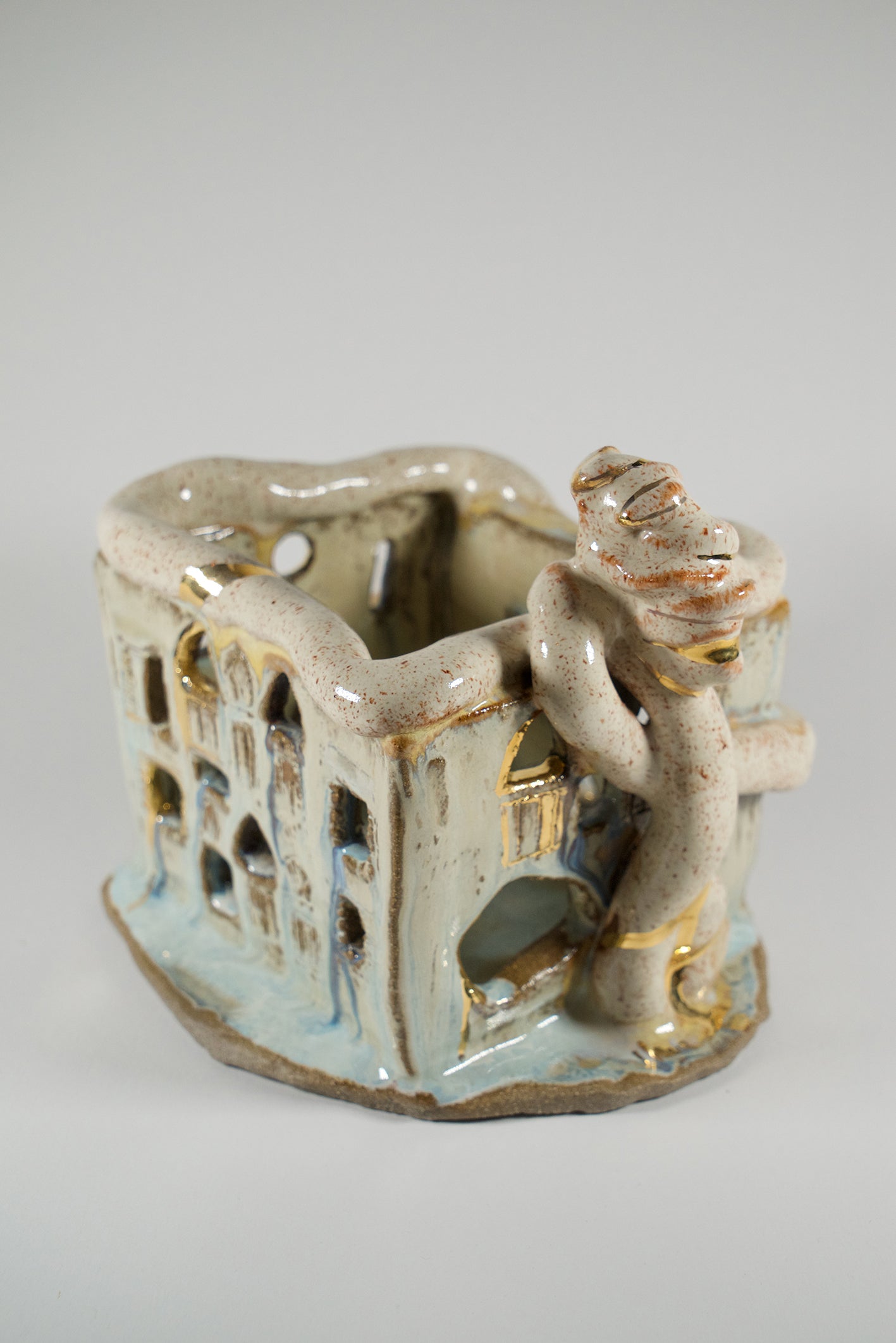 “Homes of Memory” is a collection of hand-built stoneware sculptures, each representing a Lebanese heritage house shattered—and remembered—by the August 4 explosion at the Beirut Port. Each house tells a different story of loss, love, and hope through unique finishes and symbolic adornments. From blooming flowers to small footballs and embracing hands, every detail echoes the lives once lived within these walls and the tenderness that remains.