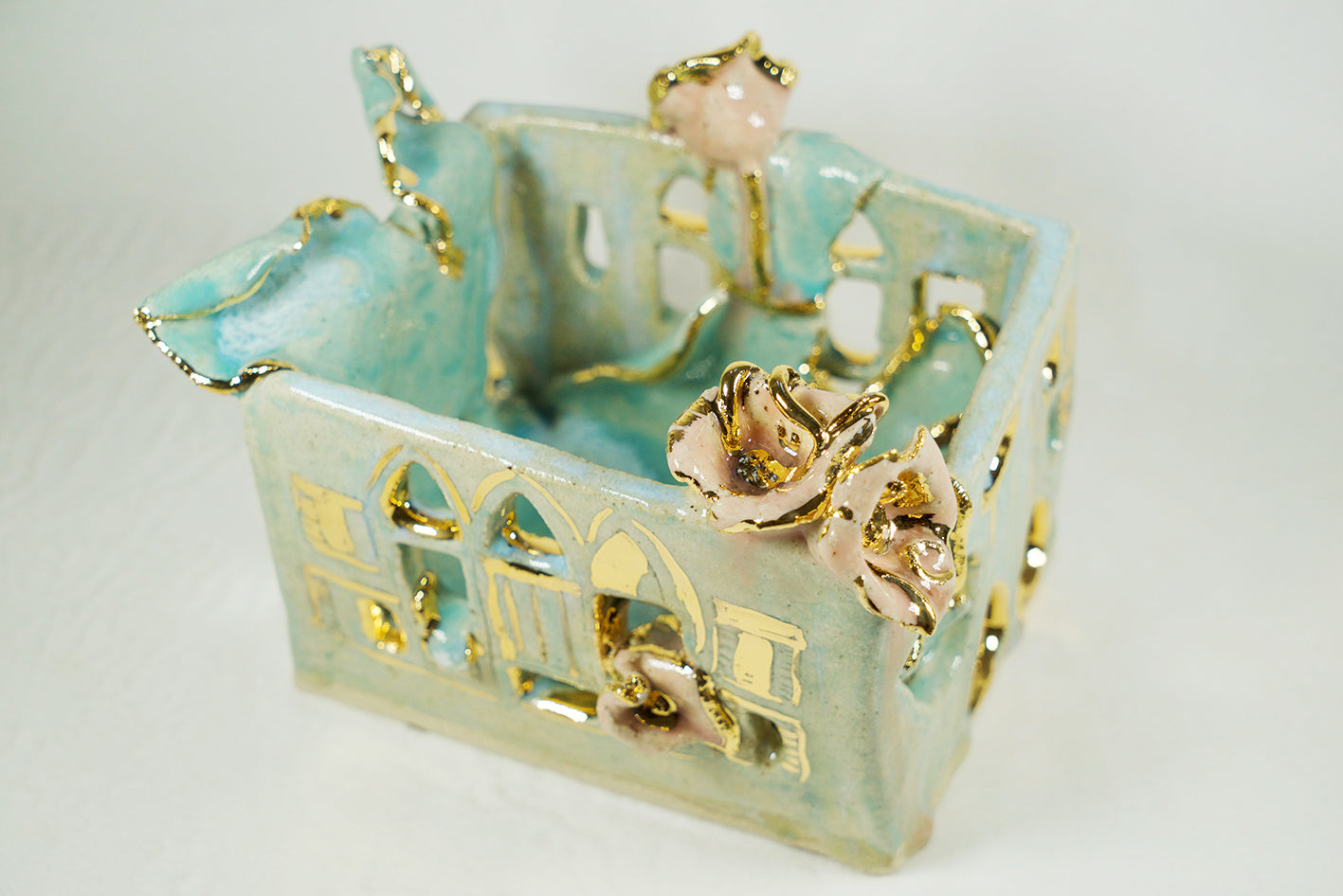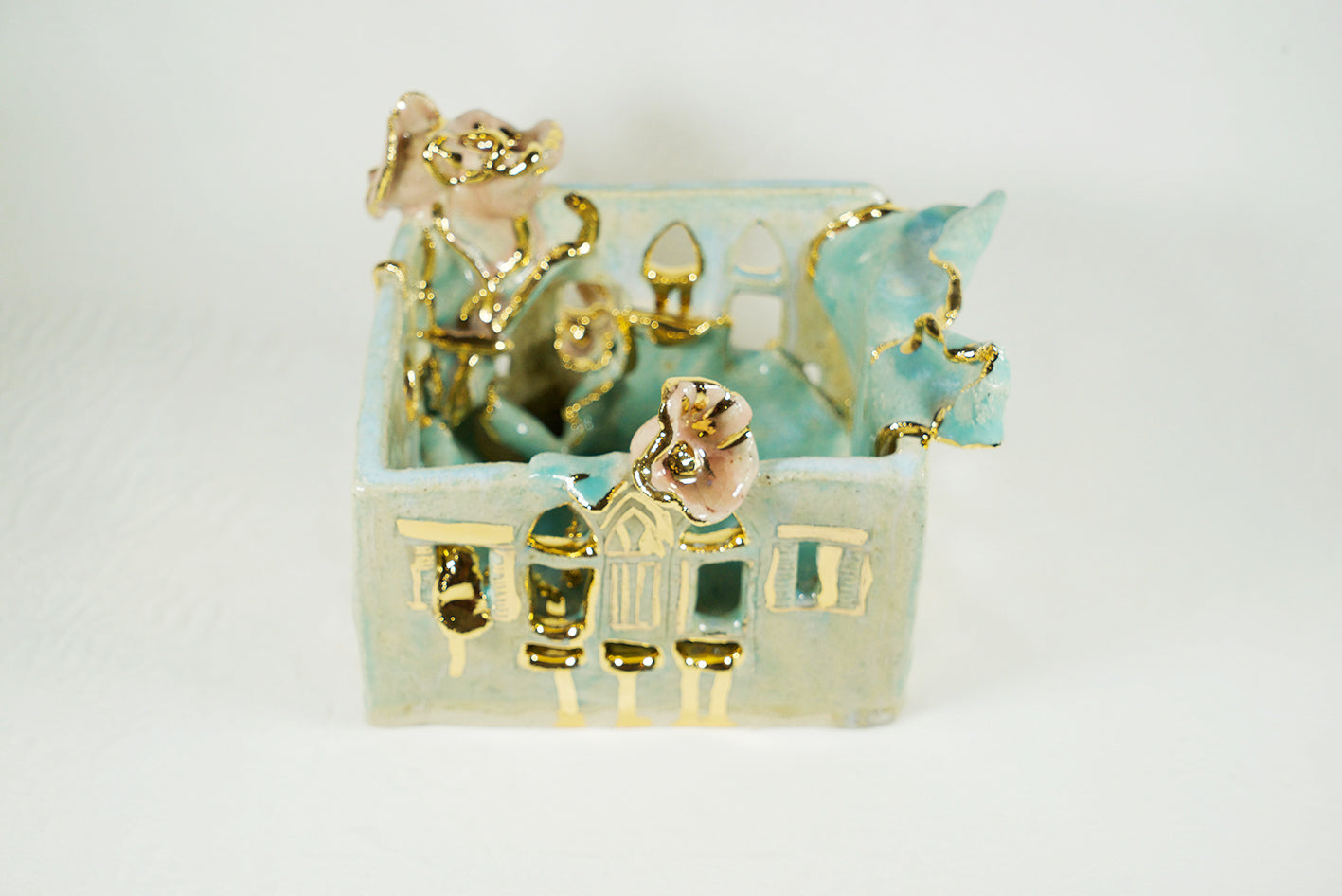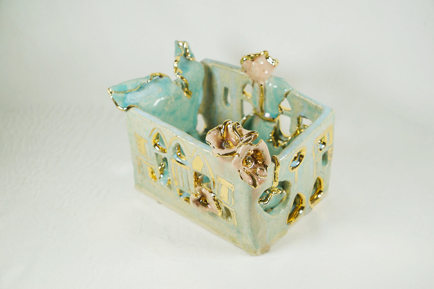 “Homes of Memory” is a collection of hand-built stoneware sculptures, each representing a Lebanese heritage house shattered—and remembered—by the August 4 explosion at the Beirut Port. Each house tells a different story of loss, love, and hope through unique finishes and symbolic adornments. From blooming flowers to small footballs and embracing hands, every detail echoes the lives once lived within these walls and the tenderness that remains.