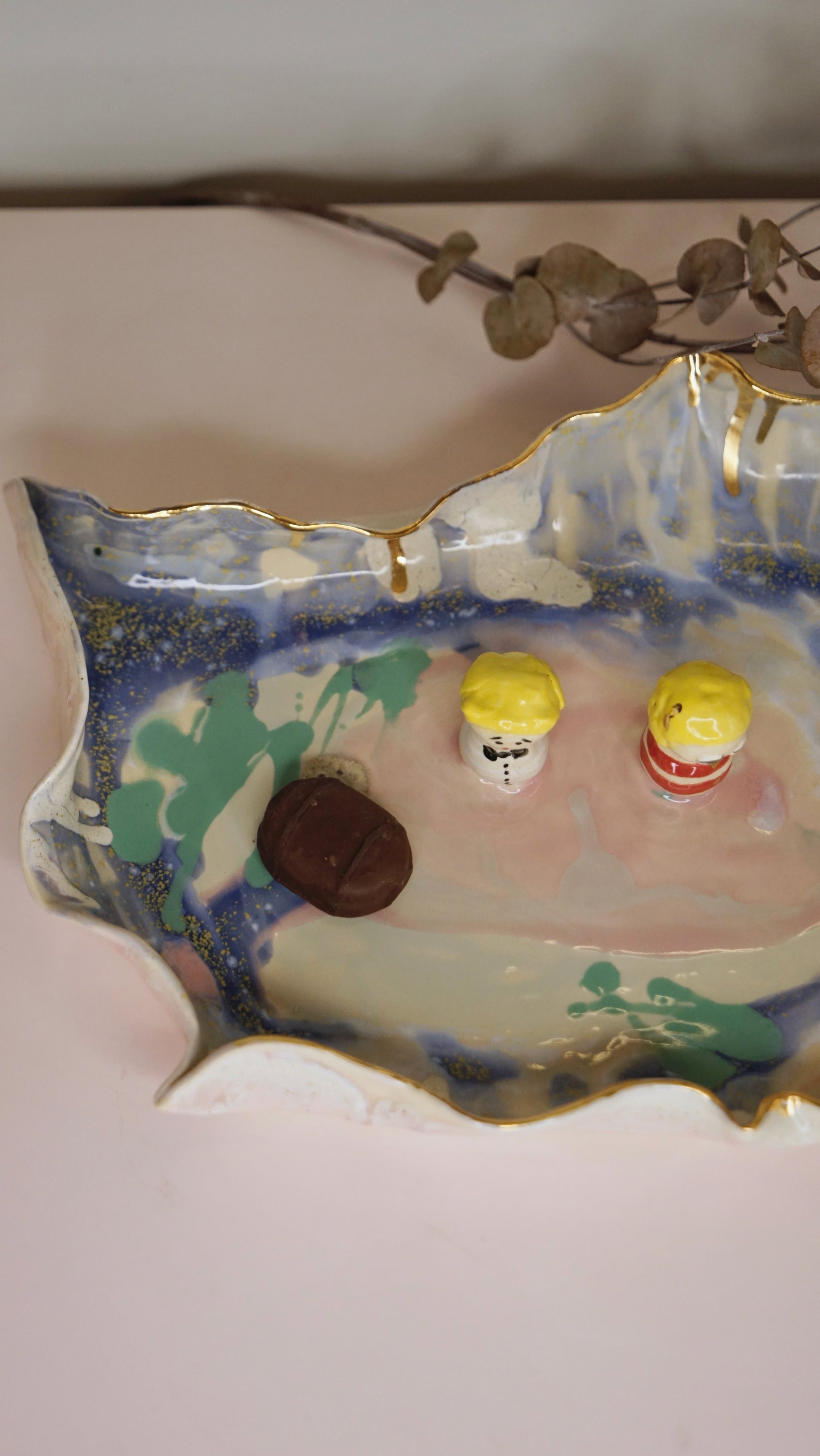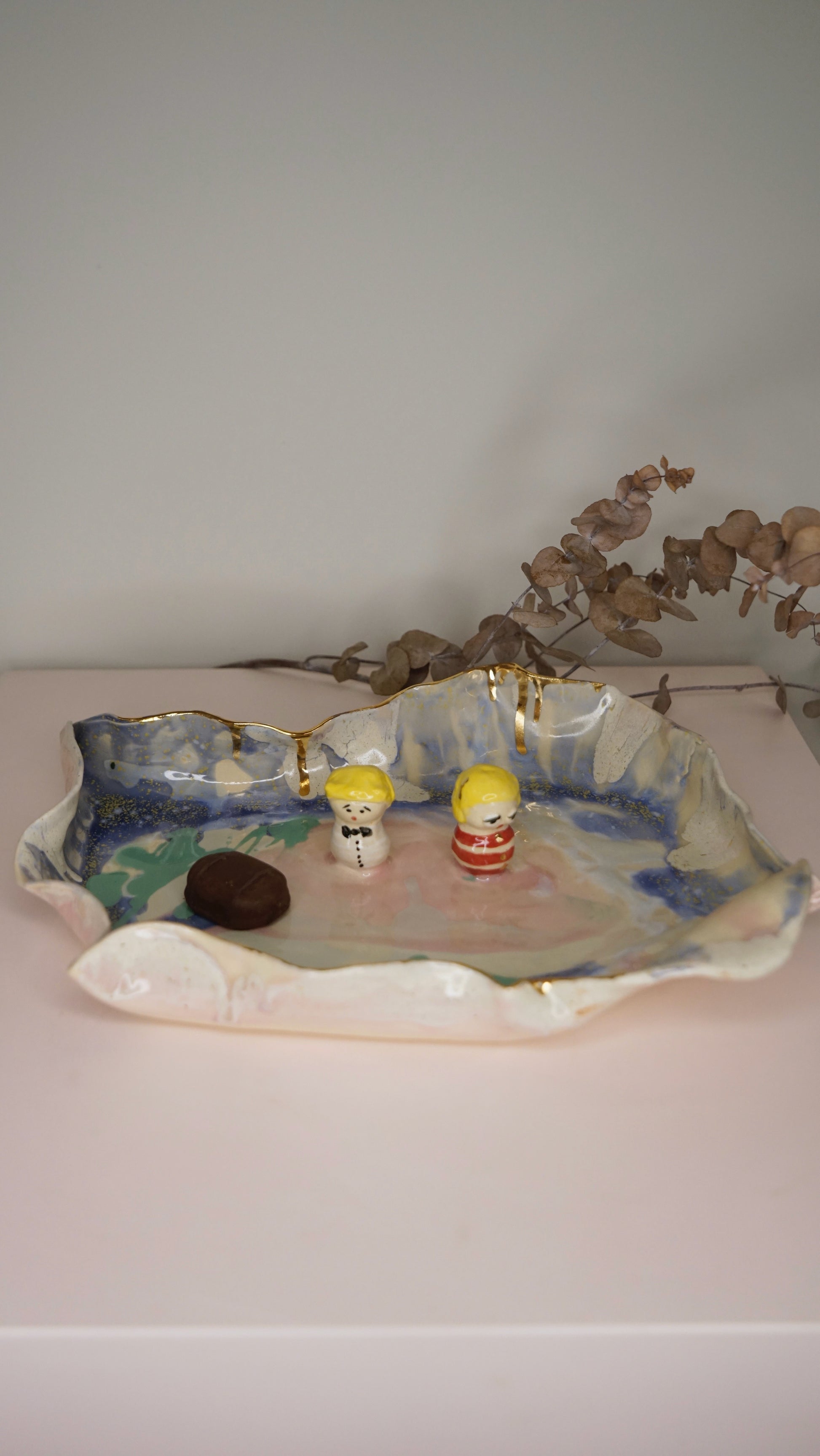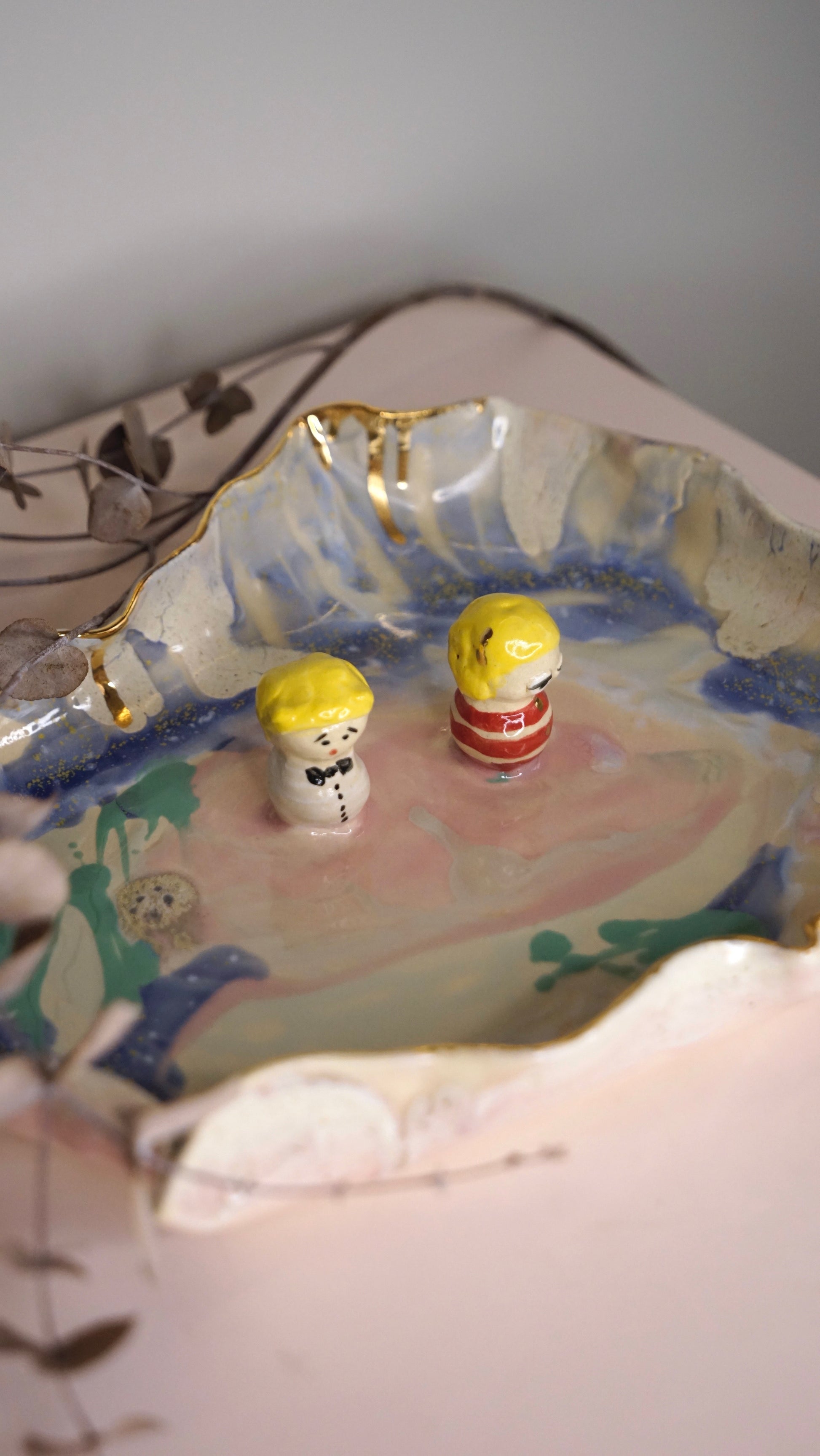 Each piece is lovingly handcrafted by Hania Jneid, carrying within it the spirit of a child’s imagination and the reverence of traditional craftsmanship. The organic shapes, joyful colors, and gold-kissed imperfections speak of a world where laughter meets ceremony, where art and function intertwine at the table.