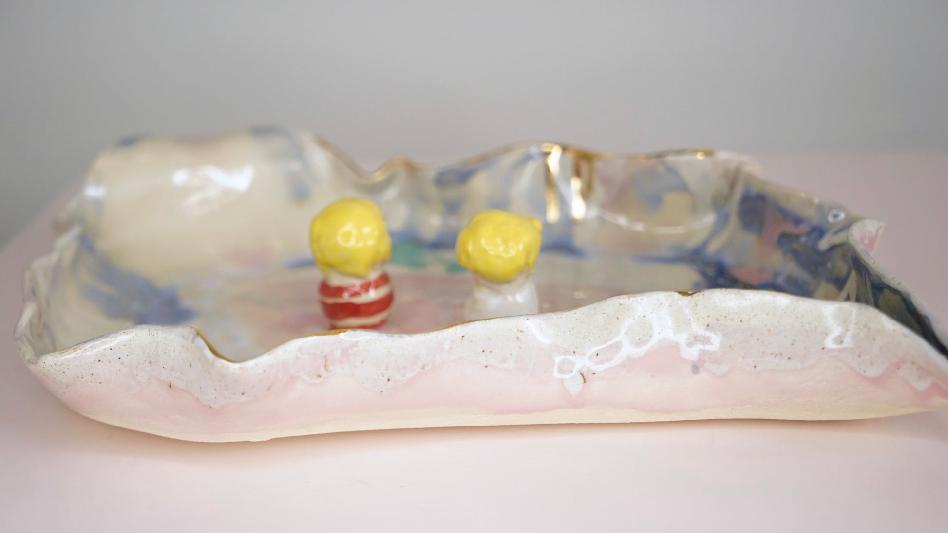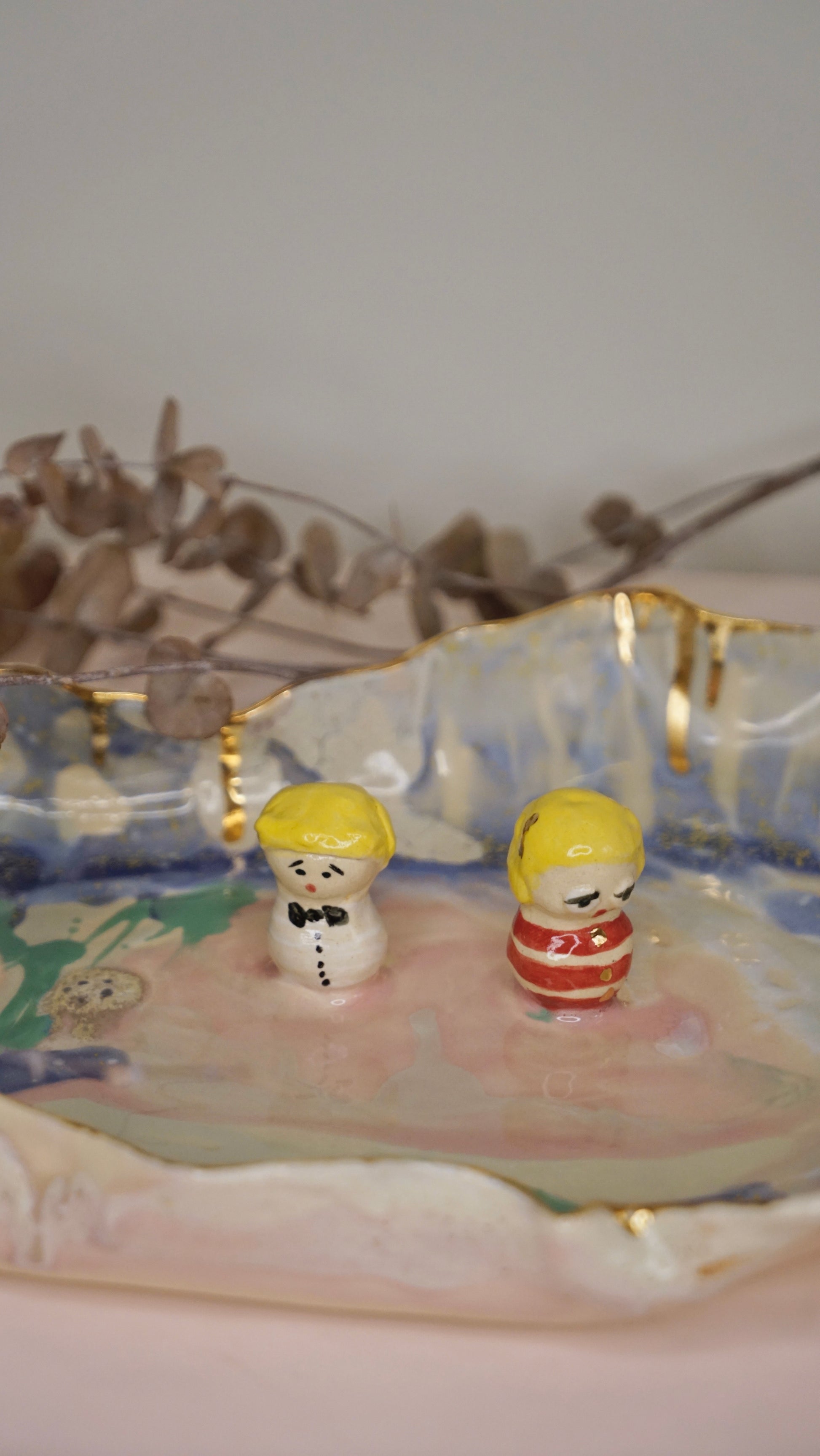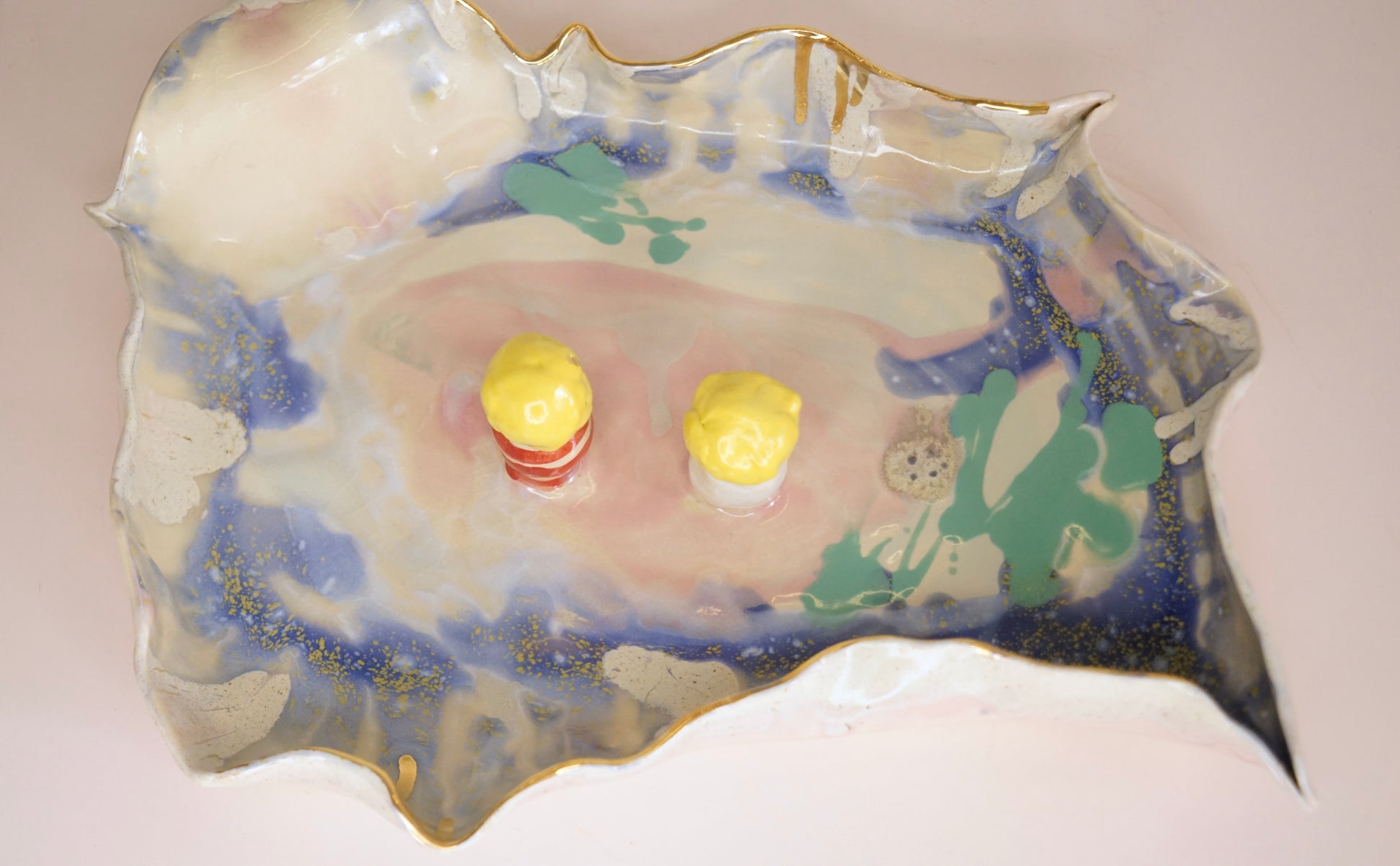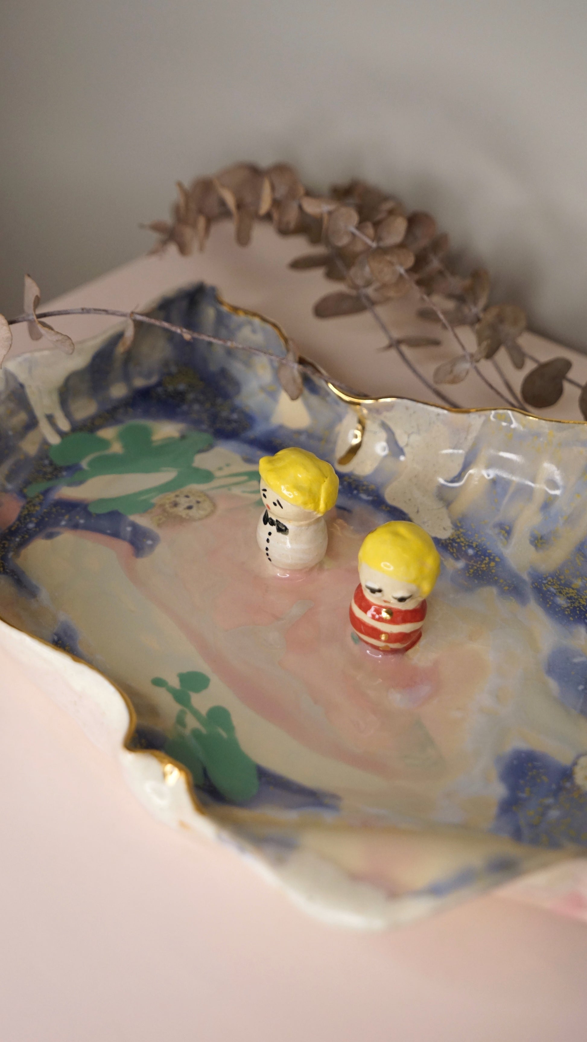 Each piece is lovingly handcrafted by Hania Jneid, carrying within it the spirit of a child’s imagination and the reverence of traditional craftsmanship. The organic shapes, joyful colors, and gold-kissed imperfections speak of a world where laughter meets ceremony, where art and function intertwine at the table.