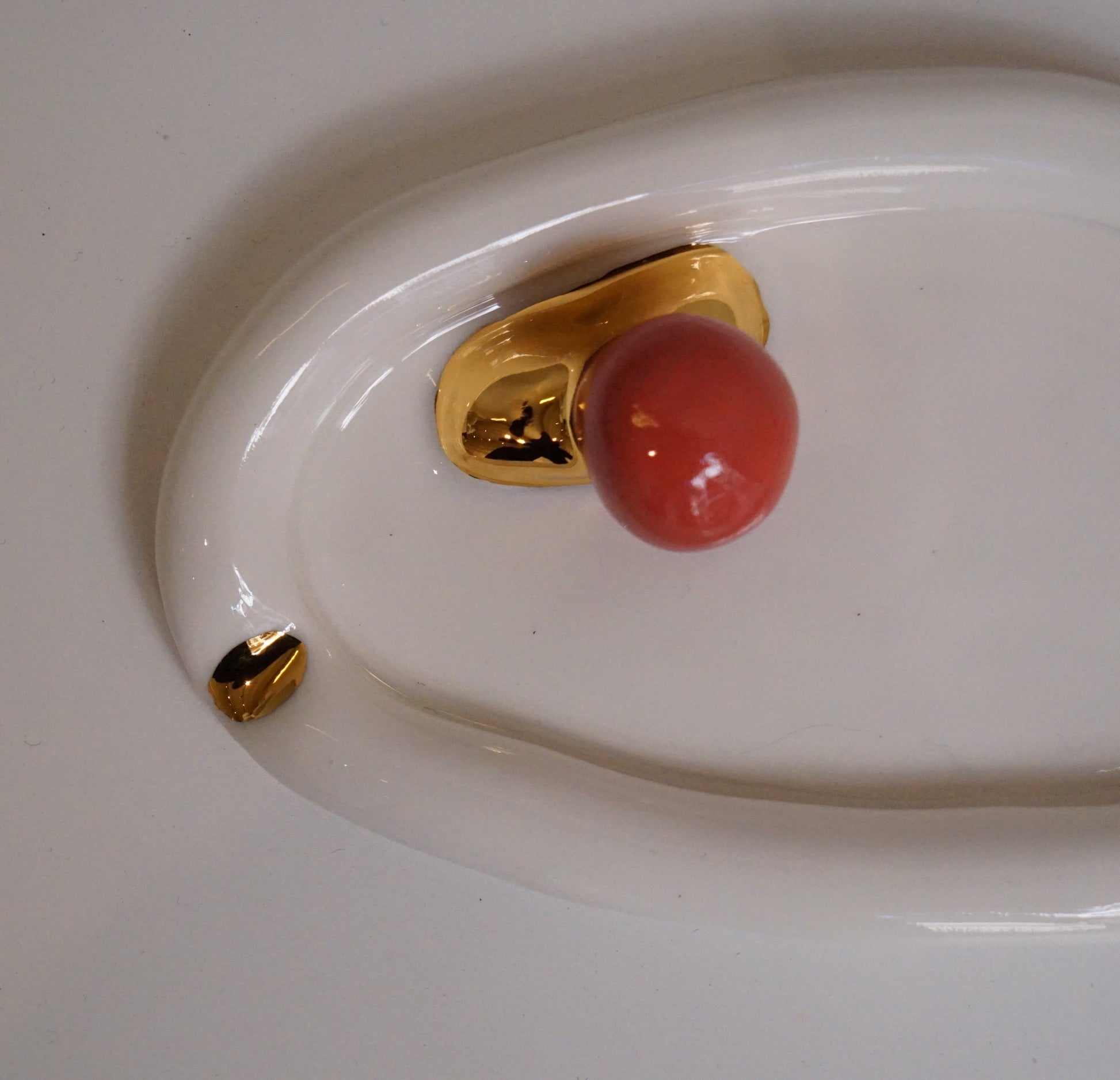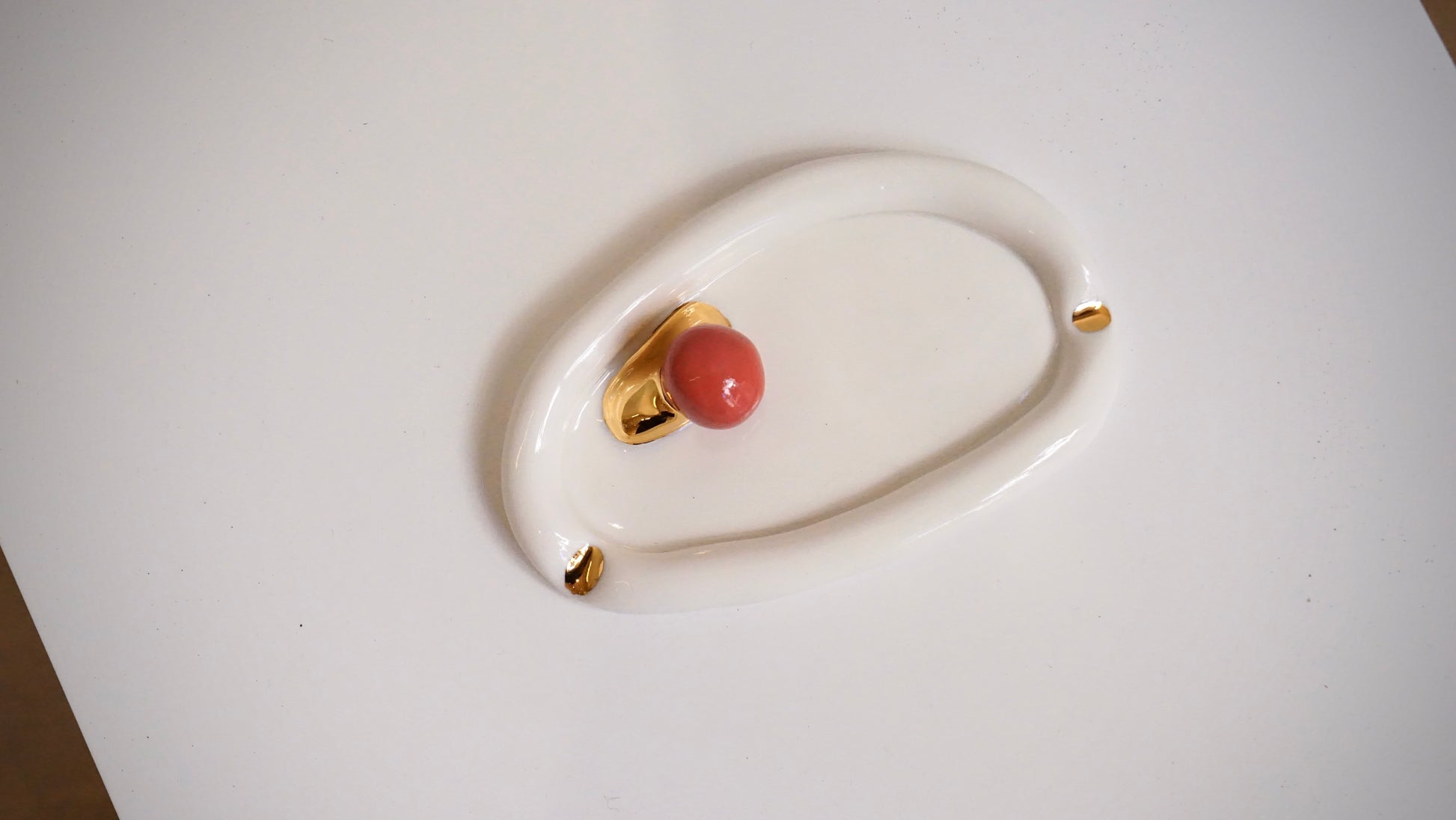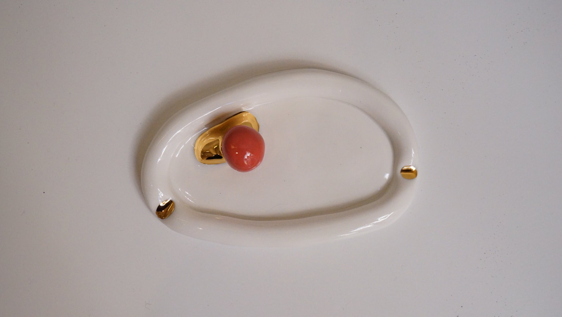 "A surreal moment suspended in time, this sculptural ashtray by Hania Jneid transforms the fleeting into the eternal. Sculpted in pure white porcelain, a pair of lips emerges from the surface, caught mid-chew with a delicate bubblegum frozen in place. Playful yet thought-provoking, the piece blurs the line between reality and illusion, turning an ephemeral act into a lasting statement. With its dreamlike quality and unexpected juxtaposition, it invites contemplation on desire, transience, and the absurdity of permanence."