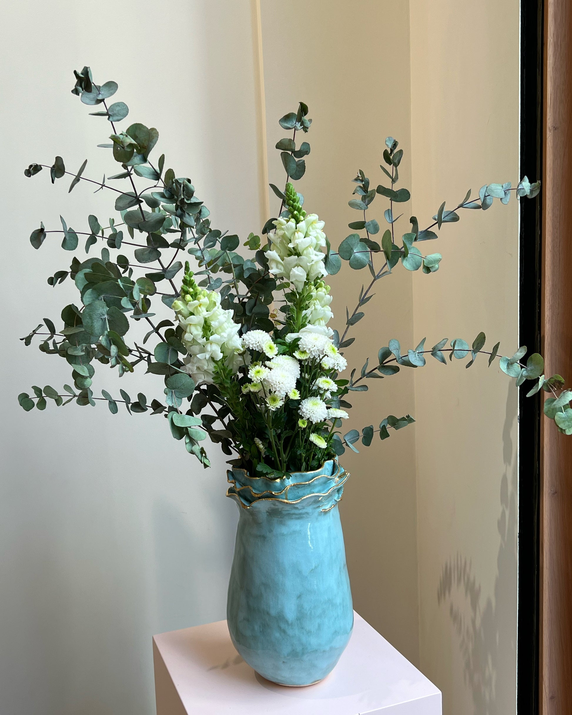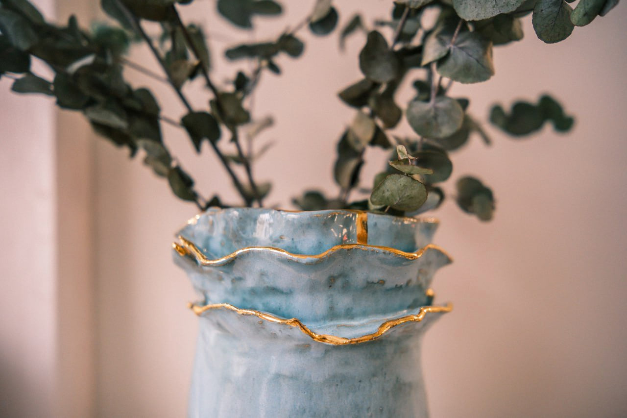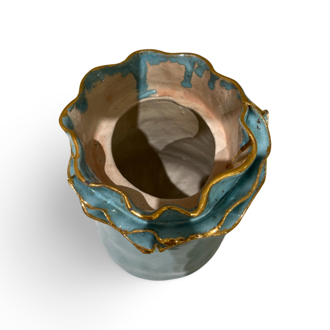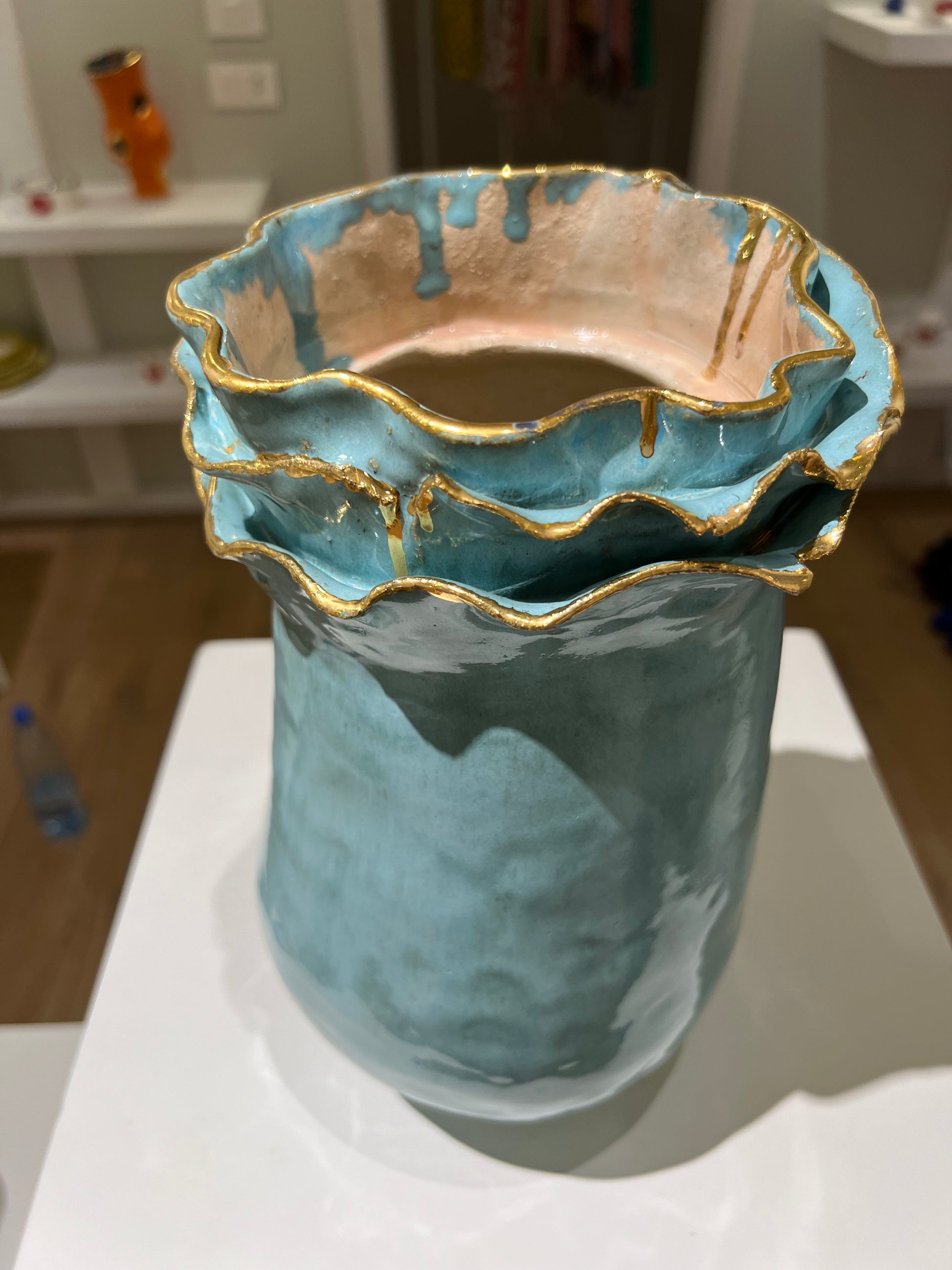Unique piece in Stoneware, hand built and hand glazed and lustred in Gold