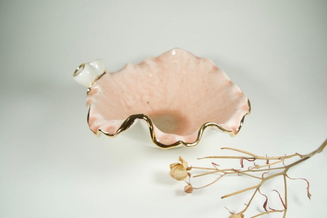 Unique Piece In white porcelain, hand built and hand glazed in pastel pink and gold lustred.