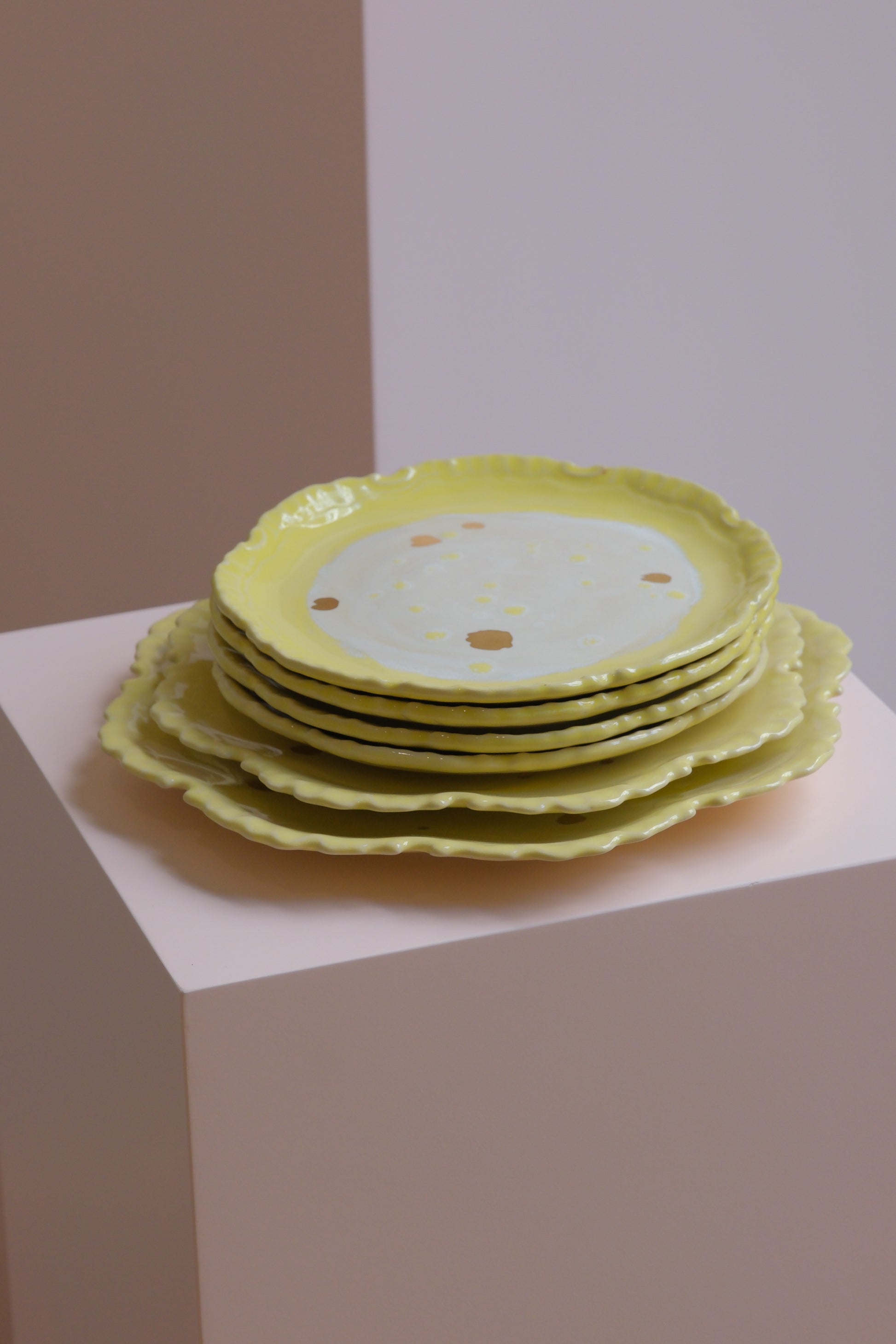 Set of 4 platers in yellow and whit Matt glaze, ornamented with Gold lustre. This set is hand built and hand painted by the artist. Unique pieces.