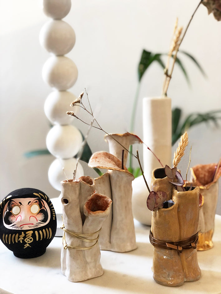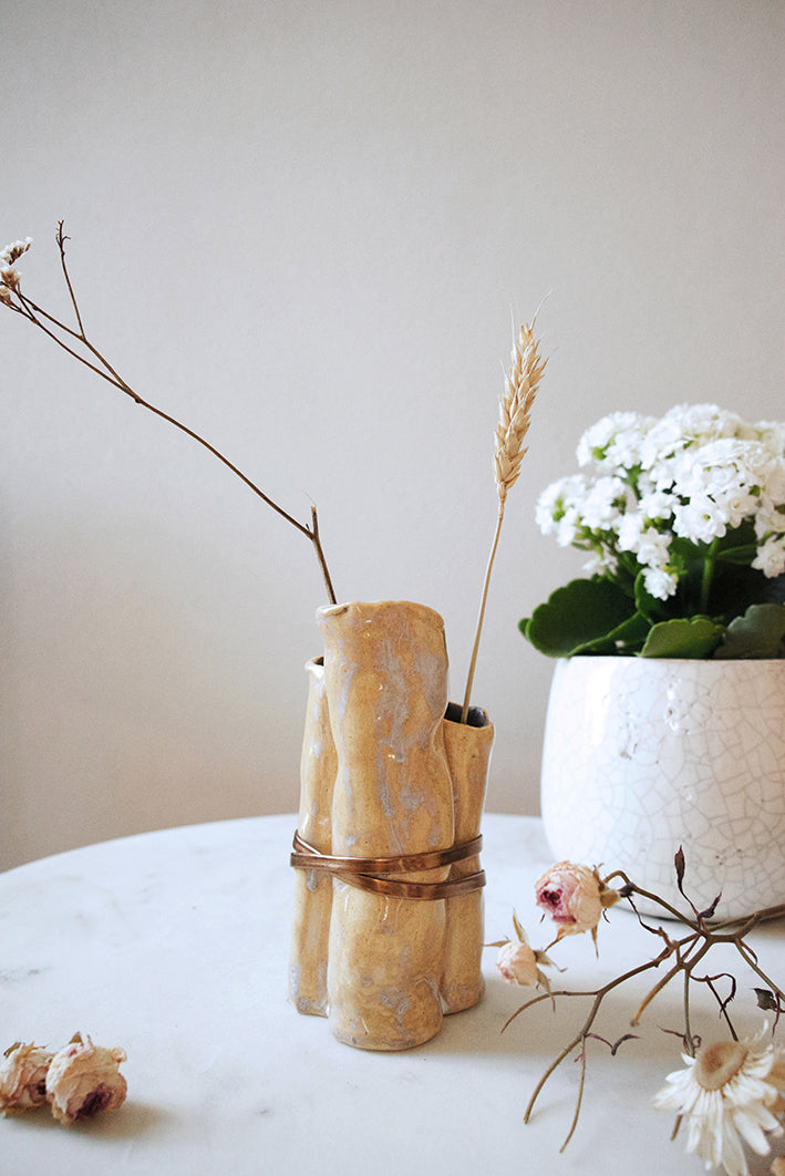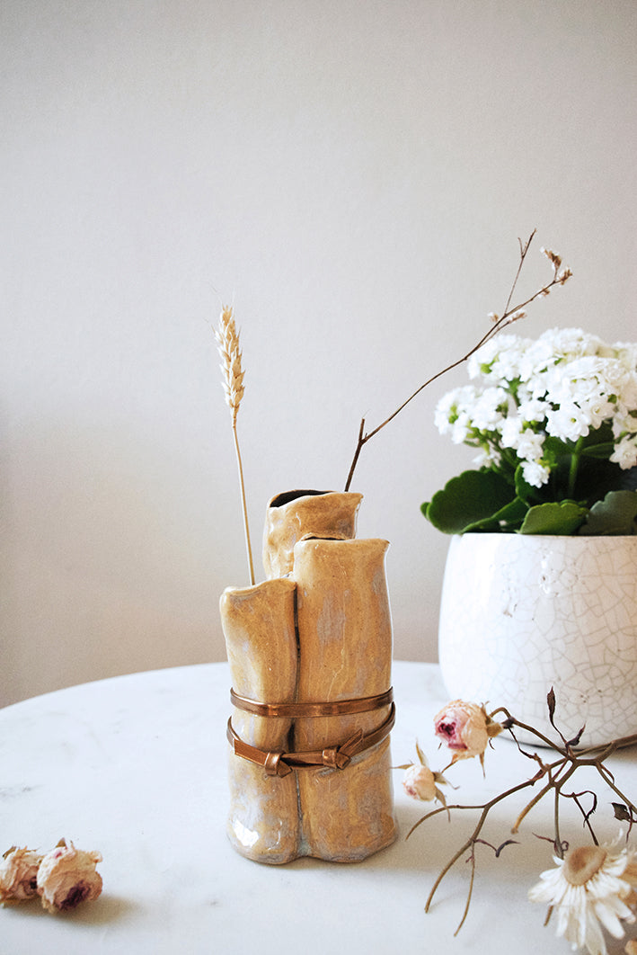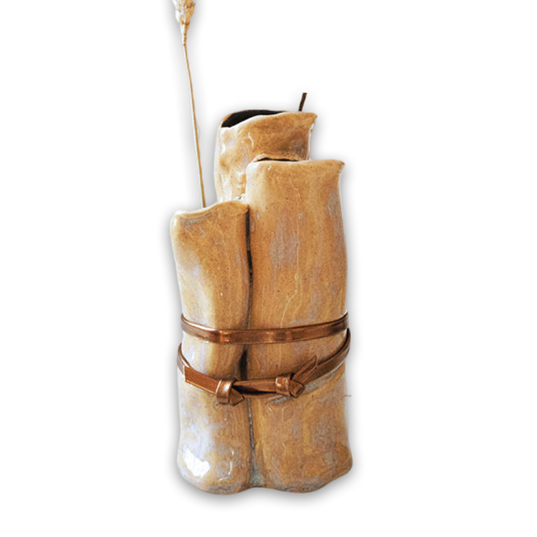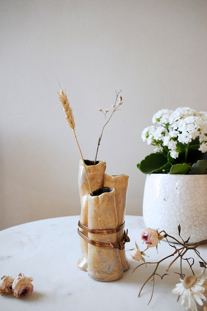Artistic creation in stoneware, hand built and hand glazed, ornamented with gold bronze glaze and bronze leather stripe.